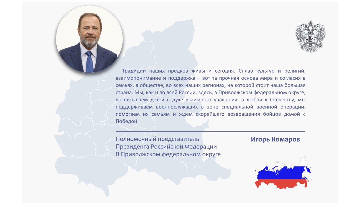 Традиции наших предков живы и сегодня. Сплав культур и религий, взаимопонимание и поддержка – вот та прочная основа мира и согласия в семьях, в обществе, во всех наших регионах, на которой стоит наша большая страна. Мы, как и во всей России, здесь, в Приволжском федеральном округе, воспитываем детей в духе взаимного уважения, в любви к Отечеству, мы поддерживаем военнослужащих в зоне специальной военной операции, помогаем их семьям и ждем скорейшего возвращения бойцов домой с Победой.