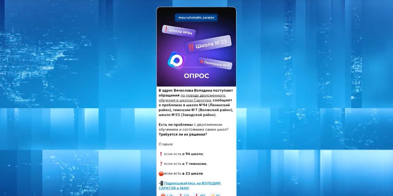 В канале «Володин Саратов» в МАХ идет опрос о проблемах в школах Саратова – № 94, № 23, гимназии № 7