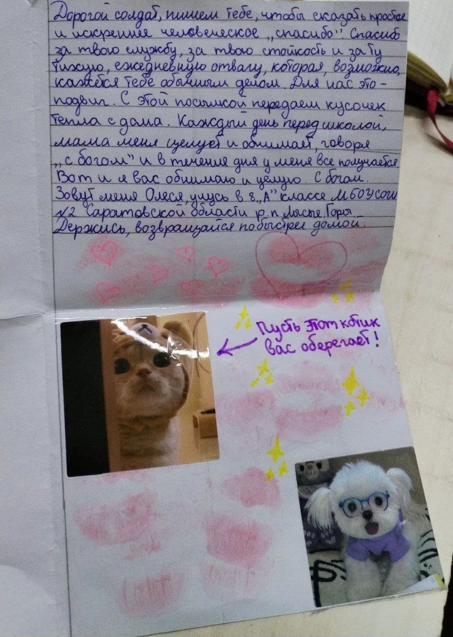 Год назад ученица 7 класса школы №2 р.п. Лысые Горы Олеся М. тоже написала слова поддержки для наших защитников, не указывая конкретного адресата. Оно попало в руки заместителю командира полка ВДВ, нашему земляку — уроженцу Пугачевского района Саратовской области.